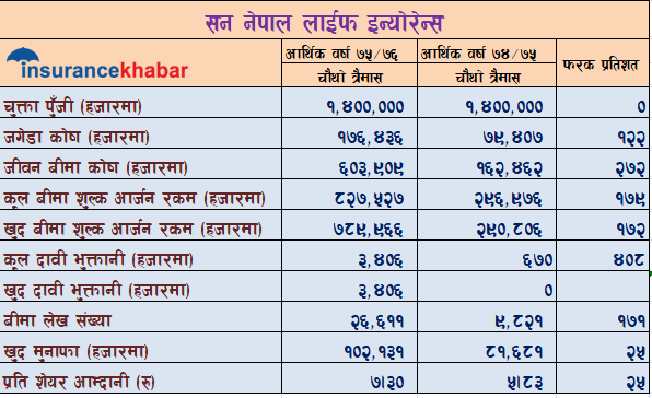 आर्थिक वर्ष २०७५ /७६ को चौथो त्रैमाससम्ममा कम्पनीले जीवन बीमा कोष २ सय ७२ प्रतिशतले बढाएर ६० करोड ३९ लाख रुपैयाँ पुर्याएको छ । अघिल्लो आर्थिक वषको सोही अवधिमा कम्पनीको जीवन बीमा कोषमा १६ करोड २४ लाख रुपैयाँ रहेको थियो ।