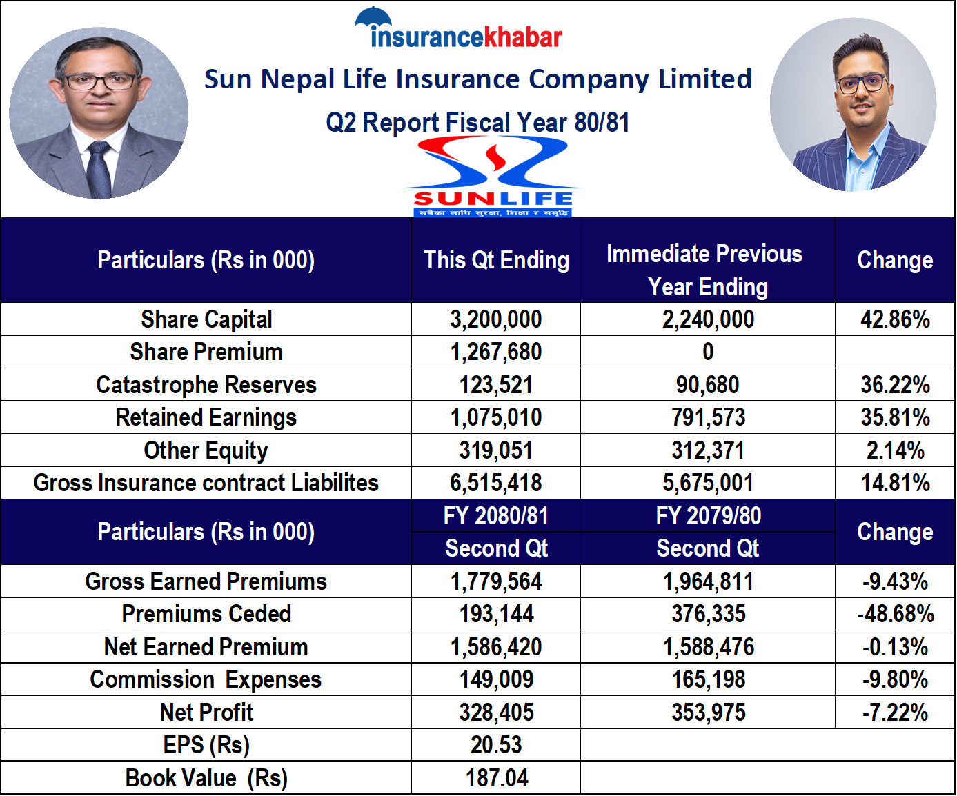 काठमाडौं ।  सन नेपाल लाइफ इन्स्योरेन्स कम्पनीले चालु आर्थिक वर्ष २०८०/८१ को दोस्रो त्रैमासिक वित्तीय विवरण सार्वजनिक गरेको छ। समीक्षा अवधिसम्म कम्पनीको खुद नाफा ३२ करोड ८४ लाख रुपैयाँ रहेको छ । जुन अघिल्लो आर्थिक वर्ष २०७९/८० को सोही अवधिसम्मको तुलनामा ७.२२ प्रतिशतले कम हो । अघिल्लो वर्ष सोही अवधिसम्म कम्पनीले ३५ करोड ३९ लाख रुपैयाँ खुद नाफा आर्जन गरेको थियो ।