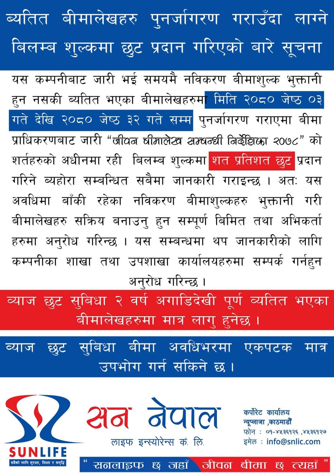 कम्पनीले २०८० जेठ ३ गतेदेखि जेठ ३२ गतेसम्मसम्म पुनर्जागरण गराएमा विलम्ब रकममा छुट दिने जनाएको छ। यस अवधिसम्ममा कम्पनीले शतप्रतिशत छुट दिने भएको छ। सो सम्बन्धी सम्पुर्ण जानकारीका लागि कम्पनीले अभिकर्ता, शाखा तथा उप शाखा कार्यालयमा बुझन आग्रह गरेको छ ।