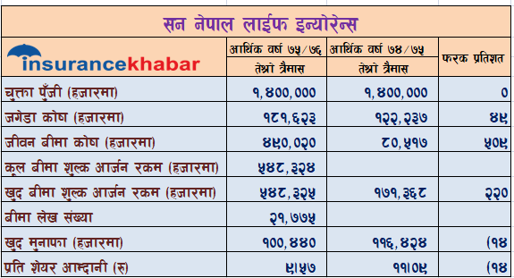सन नेपाल लाईफ इन्स्योरेन्सले आर्थिक वर्ष ७५/७६ को तेश्रो त्रैमासको वित्तिय विवरण सार्वजनिक गरेको छ ।
