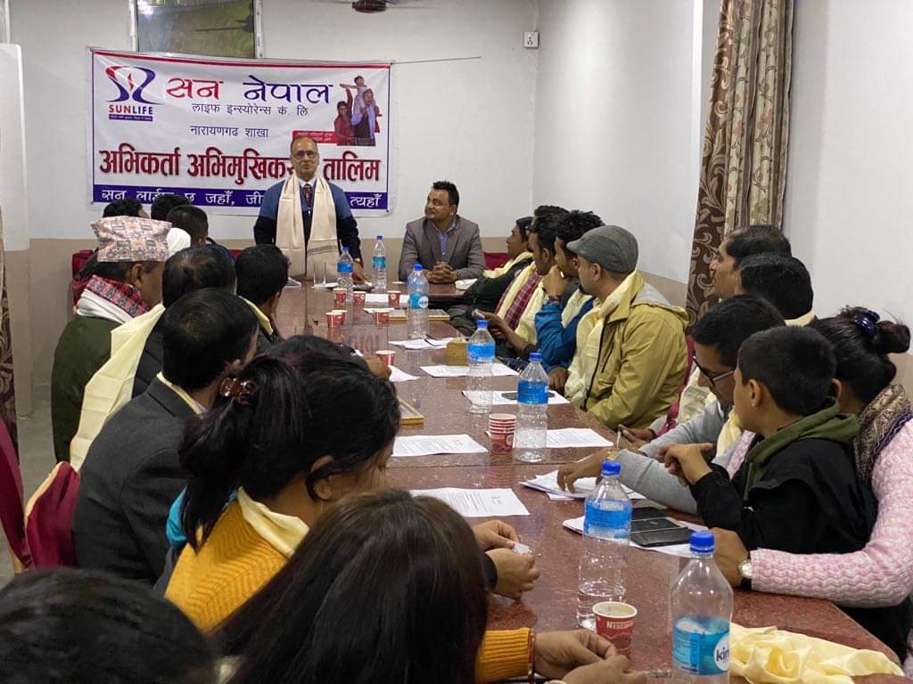 काठमाडौं । सन नेपाल लाईफ इन्स्योरेन्स कम्पनीको नारायणगढ शाखा कार्यालयले जीवन बीमा अभिकर्ता अभिमुखीकरण कार्यक्रम सन्पन्न गरेको छ । सन नेपाल लाईफका महाप्रबन्धक कमलराज गौतमको उपस्थितिमा सो तालिम सम्पन्न गरेको हो ।