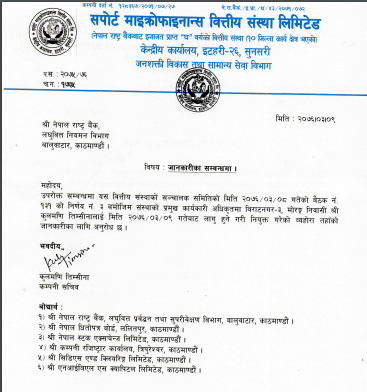 सपोर्ट माइक्रोफाइनान्स वित्तीय संस्था लिमिटेडको असार ८ गते बसेको संचालक समितिको निर्णय अनुसार कम्पनीको प्रमुख कार्यकारी अधिकृत(सिइओ)मा कुलमणि तिम्सिना नियुक्त भएका छन् ।