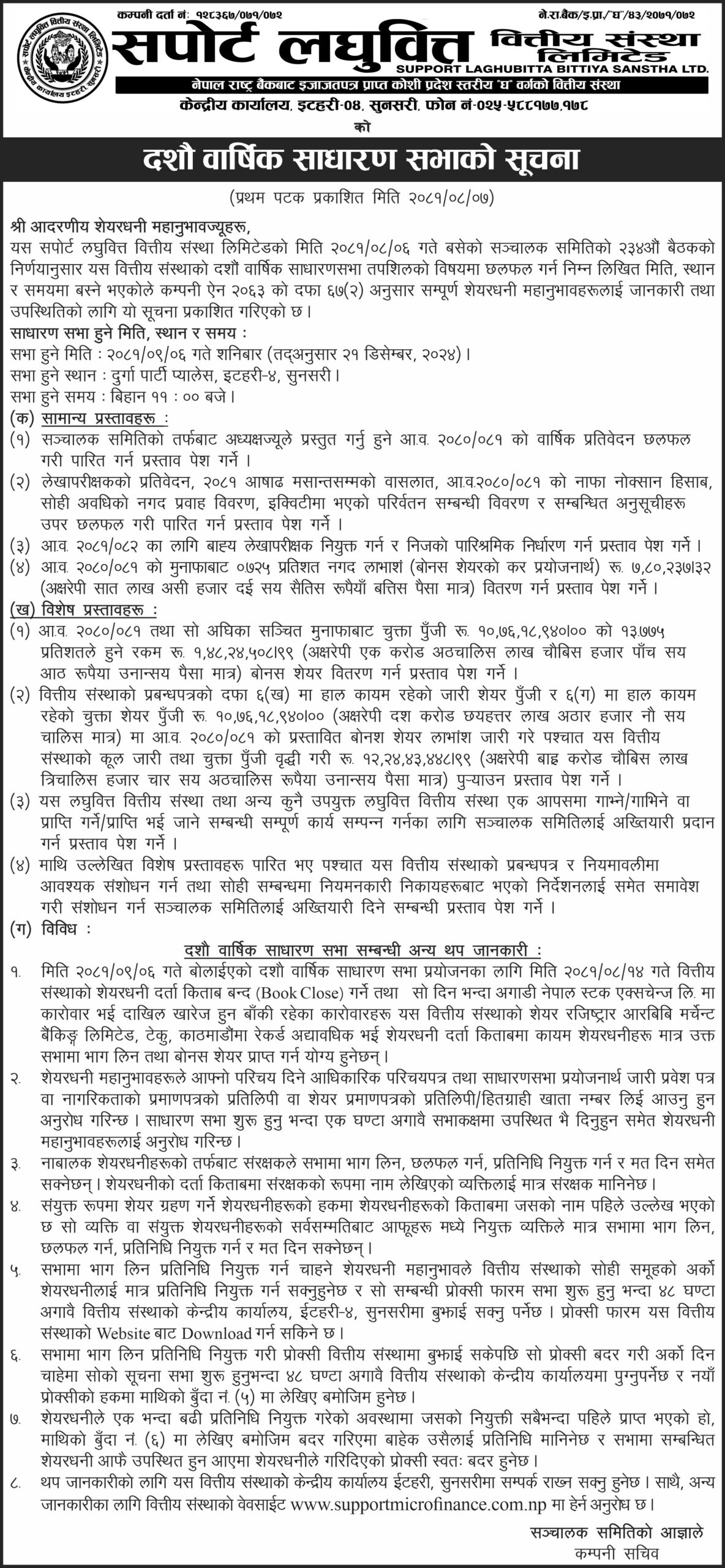 काठमाडौं । सपोर्ट लघुवित्त वित्तीय संस्था लिमिटेडले आगामी पुस ६ गते दशौं वार्षिक साधारण सभा गर्ने भएको छ । साधारण सभा सुनसरीको इटहरी ४ स्थित दुर्गा पार्टी प्यालेसमा हुने कम्पनीले जनाएको छ ।
