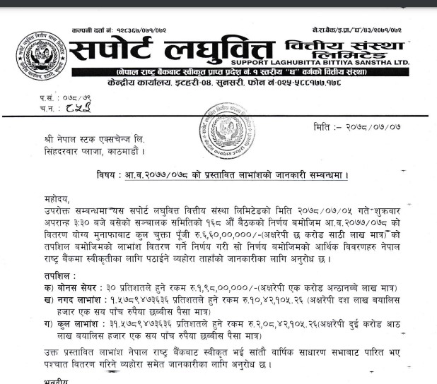 काठमाडौं । सपोर्ट लघुवित्त वित्तीय संस्थाले लाभांश प्रस्ताव गरेको छ । कम्पनीको कार्तिक ५ गते शुक्रबार बसेको संचालक समितिको बैंठकले आर्थिक वर्ष ७७/७८ को मुनाफाबाट आफ्ना शेयरधनीलाई वितरण गर्ने लाभांश प्रस्ताव गरेको हो ।