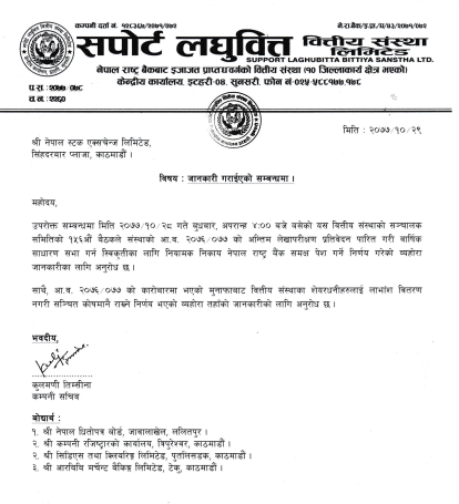 काठमाडौं । सपोर्ट लघुवित्त वित्तीय संस्थाले गत आर्थिक वर्षको कमाइबाट शेयरधनीहरुलामई लाभांश नबाँड्ने भएको छ। संस्थाले एक सुचना जारी गर्दै यस्तो जनाएको छ । यस वर्षको नाफा शेयरधनीहरुलाई लाभांशको रुपमा नबाँडि संचती कोषमा नै राख्ने जनाएको छ ।