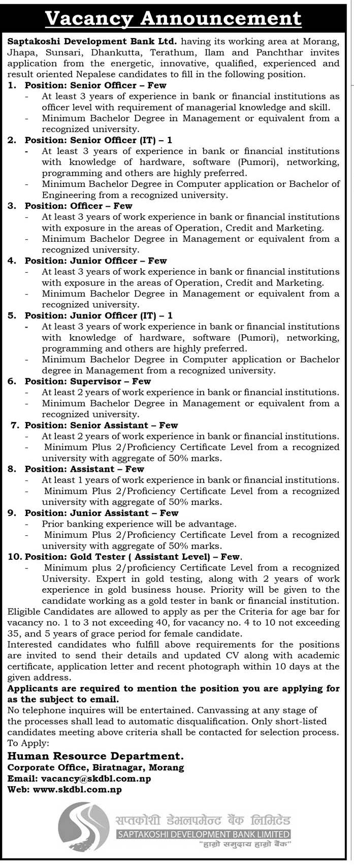 काठमाडौँ । सप्तकोशी डेभलपमेन्ट बैंक लिमिटेडले विभिन्न पदका लागि कर्मचारीको माग गरेको छ । बैंकले सिनियर अफिसरका लागि केही, सिनियर अफिसर आइटीका लागि १ जना,अफिसरका लागि केही, जुनियर अफिसरका लागि केही, सुपर भाइजरका लागि केही, सिनियर असिस्टेन्ट, असिस्टेन्ट र जुनियर असिस्टेन्टका लागि केही र गोल्ड टेस्टरका लागि केही संख्यामा कर्मचारीको माग गरेको बैंकले जनाएको छ ।