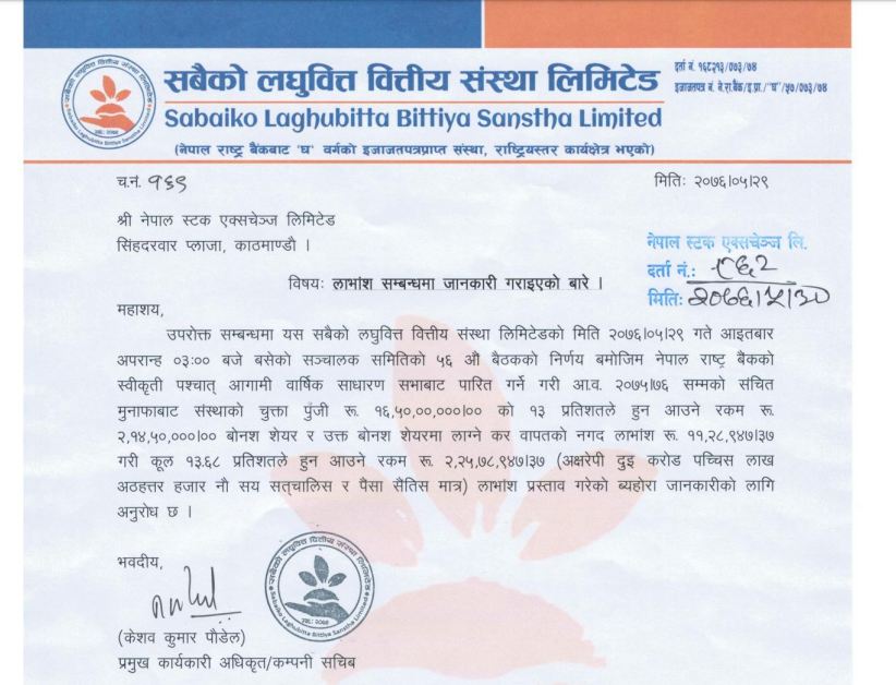 काठमाडौं । सबैको लघुवित्त वित्तीय संस्थाले आर्थिक वर्ष २०७५ ७६ को लागि लाभांश घोषणा गरेको छ । लघुवित्तले १३ प्रतिशत बोनस सेयर दिने घोषणा गरेको छ । कम्पनीको आइतबार बसेको सञ्चालक समिति बैठकले आफ्ना शेयरधनीहरुलाई १३ प्तिशत बोनस सेयर दिने निर्णय गरेको हो ।