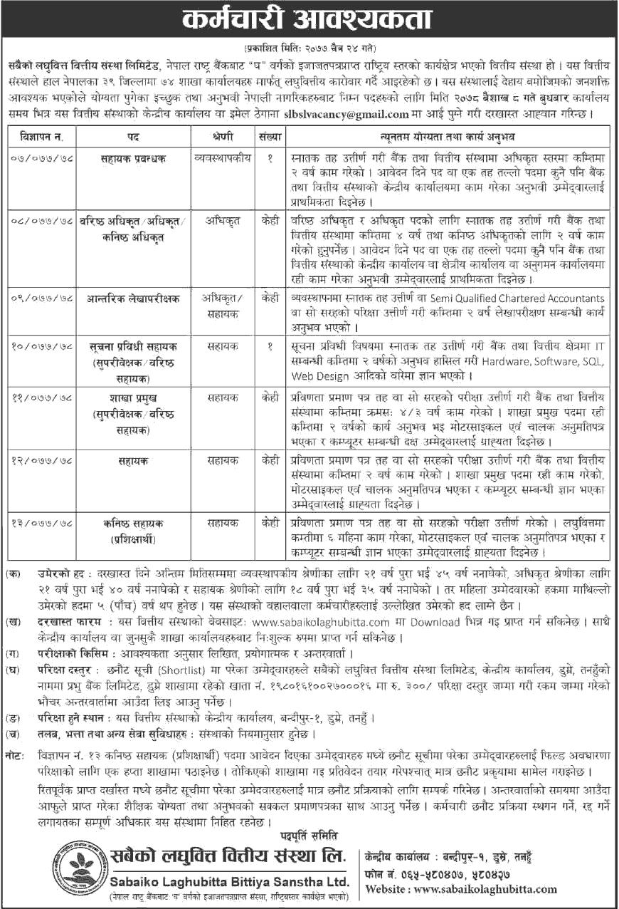 संस्थाले आफ्नो विभिन्न शाखा कार्यालयका लागि कर्मचारीको माग गरेको हो । ईच्छकु तथा योग्यता पुगेकाले बैशाख ८ गतेसम्म आवेदन दिइसक्नुपर्नेछ ।