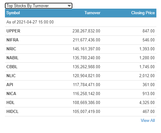 त्यसैगरी आज नेपाल पुनर्बीमाको १४ करोड ५१ लाख रुपैयाँको शेयर कारोबार भएको छ । नविल बैंकको १३ करोड ५७ लाख रुपैयाँको शेयर कारोबार भएको छ । छिमेक लघुवित्तको १३ करोड ५२ लाख रुपैयाँको शेयर कारोबार भएको छ ।