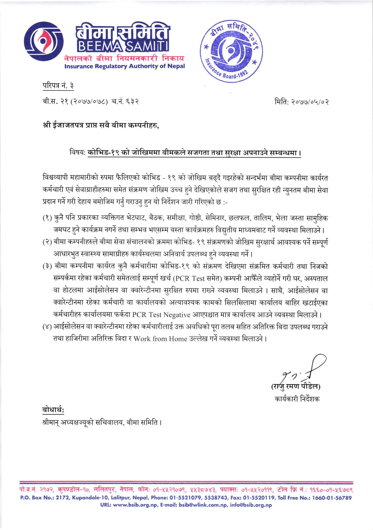 त्यसैगरी, समितिद्वारा आज जारी निर्देशनमा बीमा कम्पनीमा कार्यरत कुनै कर्मचारीमा कोरोना भाइरस देखिएमा उक्त कर्मचारी र उक्त कर्मचारीको सम्पर्कमा रहेका अन्य कर्मचारीको समेत पिसिआर परिक्षण गर्ने खर्च कम्पनीले व्यहोर्ने गरी परिक्षण गराउन भनिएको छ । समितिद्वारा जारी निर्देशनमा आईशोलेशन वा क्वारेन्टिनमा रहेका कर्मचारीले पुरै तलव पाउने गरी अतिरिक्त विदाको व्यवस्था गर्न र घरैबाट काम गर्ने कर्मचारीलाई हाजिरीमा वर्क फ्रम होमको व्यवस्था गर्नु गराउन निर्देशन दिइएको छ ।