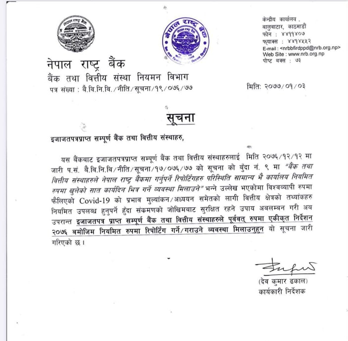 लकडाउनपछि नेपाल राष्ट्र बैंकले नियमित हुने रिपोर्टिङ अवस्था सामान्य भएको सात दिनभित्र गर्न निर्देशन दिएको थियो । जसले गर्दा बैंकिङ क्षेत्रमा के कस्तो भइरहेको छ भन्ने थाहा नै नहुने अवस्था आएपछि पहिलेजस्तै नियमित रिपोर्टिङ गर्न निर्देशन दिएको राष्ट्र बैंकले जनाइएको छ ।