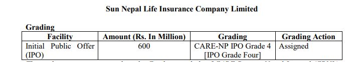 गत आर्थिक वर्ष संचालन अनुमति पाएर सञ्चालनमा आएको नयाँ मध्येको सन नेपाल लाइफ इन्स्योरेन्स कम्पनीले सर्बसाधारणको लागि प्राथमिक शेयर निष्काशनका लागि आइपिओ रेटिङ गरेको छ। कम्पनीले क्रेडिट रेटिङ गर्ने कम्पनी केयर रेटिङ नेपाल मार्फत क्रेडिट रेटिङ गरेको हो।