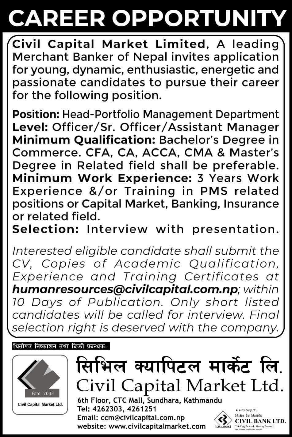 काठमाडौं । सिभिल क्यापिटल मार्केटले कर्मचारीको माग गरेको छ । क्यापिटलले हेड पोर्टफोलियो म्यानेजमेन्ट डिपार्टमेन्टका लागि अफिसर, सिनियर अफिसर र असिस्टेन्ट म्यानेजर माग गरेको छ । ईच्छुक तथा योग्यता पुगेकाले सुचना प्रकाशित भएको मितिले १० दिनभित्र आवेदन दिनुपर्नेछ ।