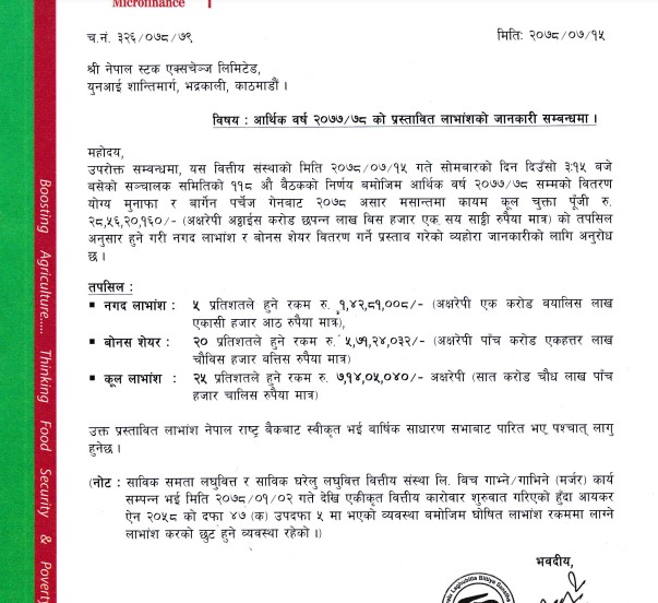 उक्त प्रस्तावित लाभांश नेपाल राष्ट्र बैंकले स्वीकृति दिएपछि र कम्पनीको आगामी साधारणसभाले पारित गरेपछि लगानीकर्ताले प्राप्त गर्नेछन् ।