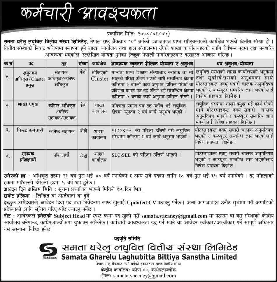 काठमाडौं । समता घरेलु लघुवित्त वित्तीय संस्थाले विभिन्न पदका लागि कर्मचारीको माग गरेको छ । संस्थाले अनुगमन अधिकृतका लागि केही, शाखा प्रमुखका लागि केही, फिल्ड कर्मचारीका लागि केही र सहायक प्रशिक्षर्थीका लागि केही संख्यामा कर्मचारीको माग गरेको छ ।