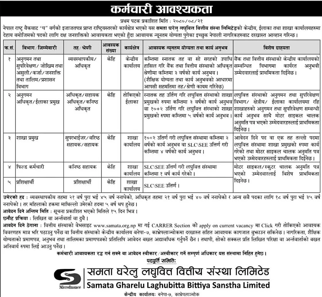 काठमाडौं । समता घरेलु लघुवित्त वित्तीय संस्थाले विभिन्न पदका लागि कर्मचारी माग गरेको छ । कम्पनीले विभिन्न पाँच पद तथा तहका लागि कर्मचारी माग गरेको हो ।