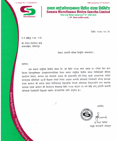 समता माइक्रोफाइनान्स वित्तीय संसथाको कम्पनी सचिवमा विश्वराज श्रेष्ठलाई नियुक्त गरिएको छ । असार ३० गते बसेको कम्पनीको संचालक समितिको बैठकको निर्णय अनुसार संस्थाले सचिवको पदमा उनलाई नियुक्त गरेको हो ।
