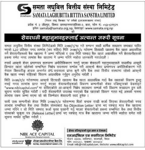 त्यसैगरी, संस्थाले हालसम्म हितग्राही खातामा बैंक खाता अद्यावधिक नगराएका शेयरधनीहरूलाई आफ्नो निक्षेप सदस्यकहाँ सम्पर्क राखि हितग्राही खातामा बैंक खाता अद्यावधिक गराउन आग्रह गरेको छ ।