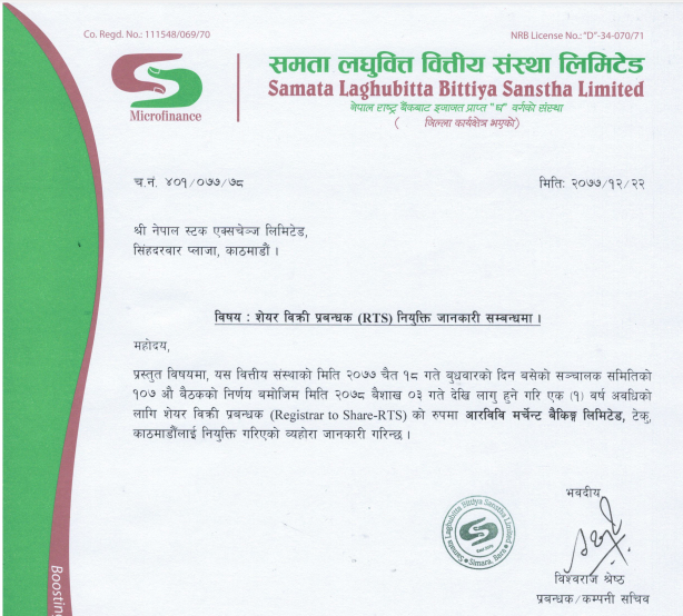 काठमाडौं । समता लघुवित्त वित्तीय संस्थाले शेयर रजिष्ट्रारमा आरबिबि मर्चेण्ट बैंकिङ लिमिटेडलाई नियुक्त गरेको छ । कम्पनीको चैत १८ गते बसेको सञ्चालक समितिको बैठकले विसं २०७८ वैशाख ३ गतेदेखि लागू हुने गरी एक वर्षको लागि शेयर रजिष्ट्रार तथा विक्री प्रबन्धकमा नियुक्त गरेको हो ।