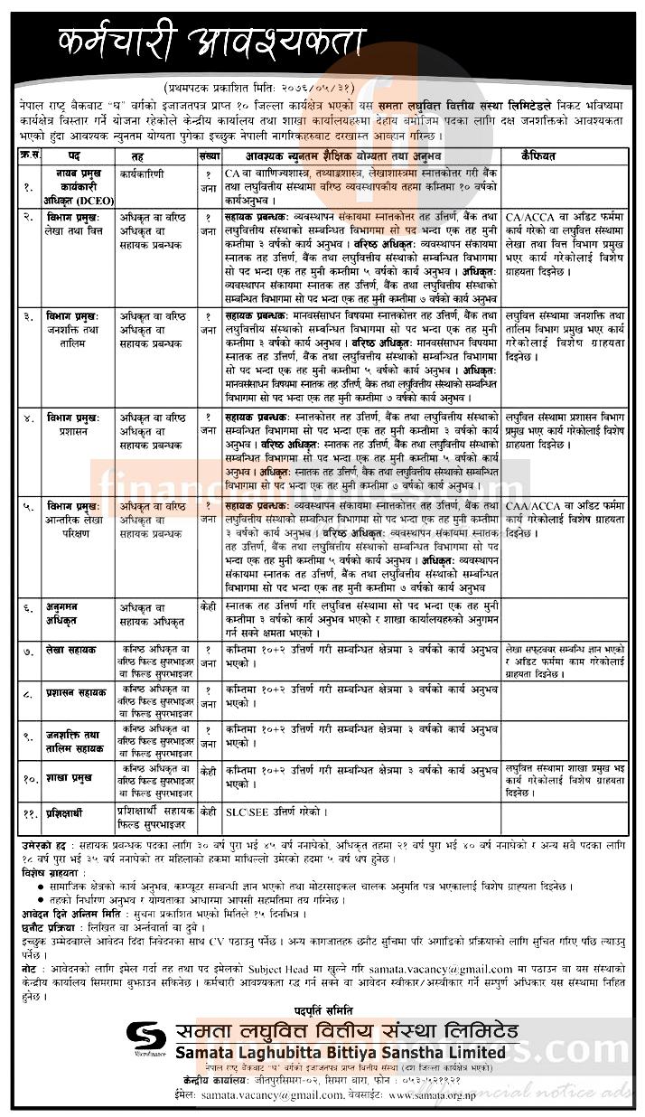 समता लघुवित्तले माग्यो ११ पदका लागि कर्मचारी, एसएलसी पासलाई पनि अवसर