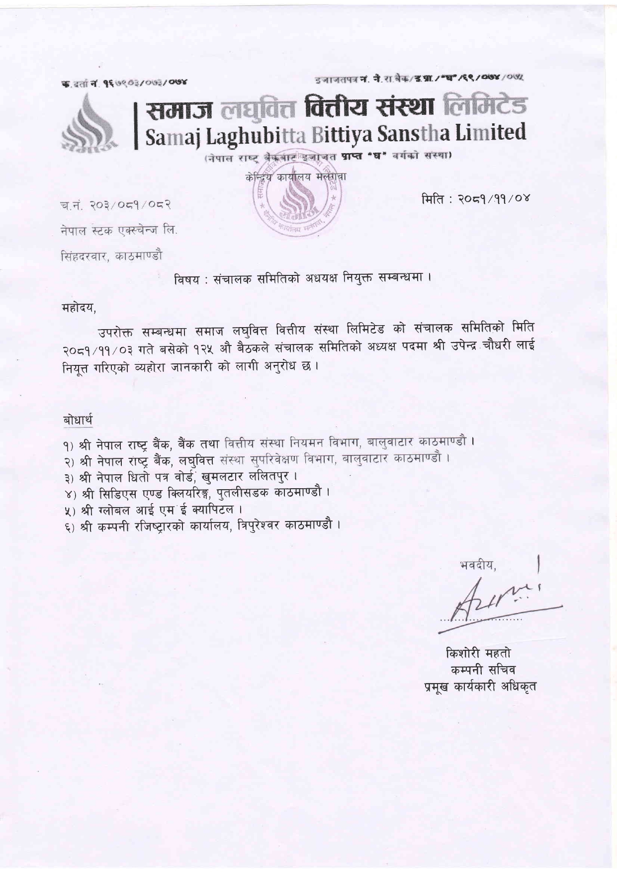काठमाडौं । समाज लघुवित्त वित्तीय संस्थाको अध्यक्षमा उपेन्द्र चौधरी नियुक्त भएका छन् । कम्पनीको सञ्चालक समितिको फागुन ३ गते बसेको बैठकले उनलाई सञ्चालक समितिको अध्यक्ष पदमा नियुक्त गर्ने निर्णय गरेको हो । यसअघिकी अध्यक्ष सन्तोषी महतोले माघ २५ गते घरायसी कारण देखाई अध्यक्ष पदबाट दिएको राजिनामा कम्पनीको फागुन २ गते बसेको सञ्चालक समितिले स्वीकृत गरेको हो ।