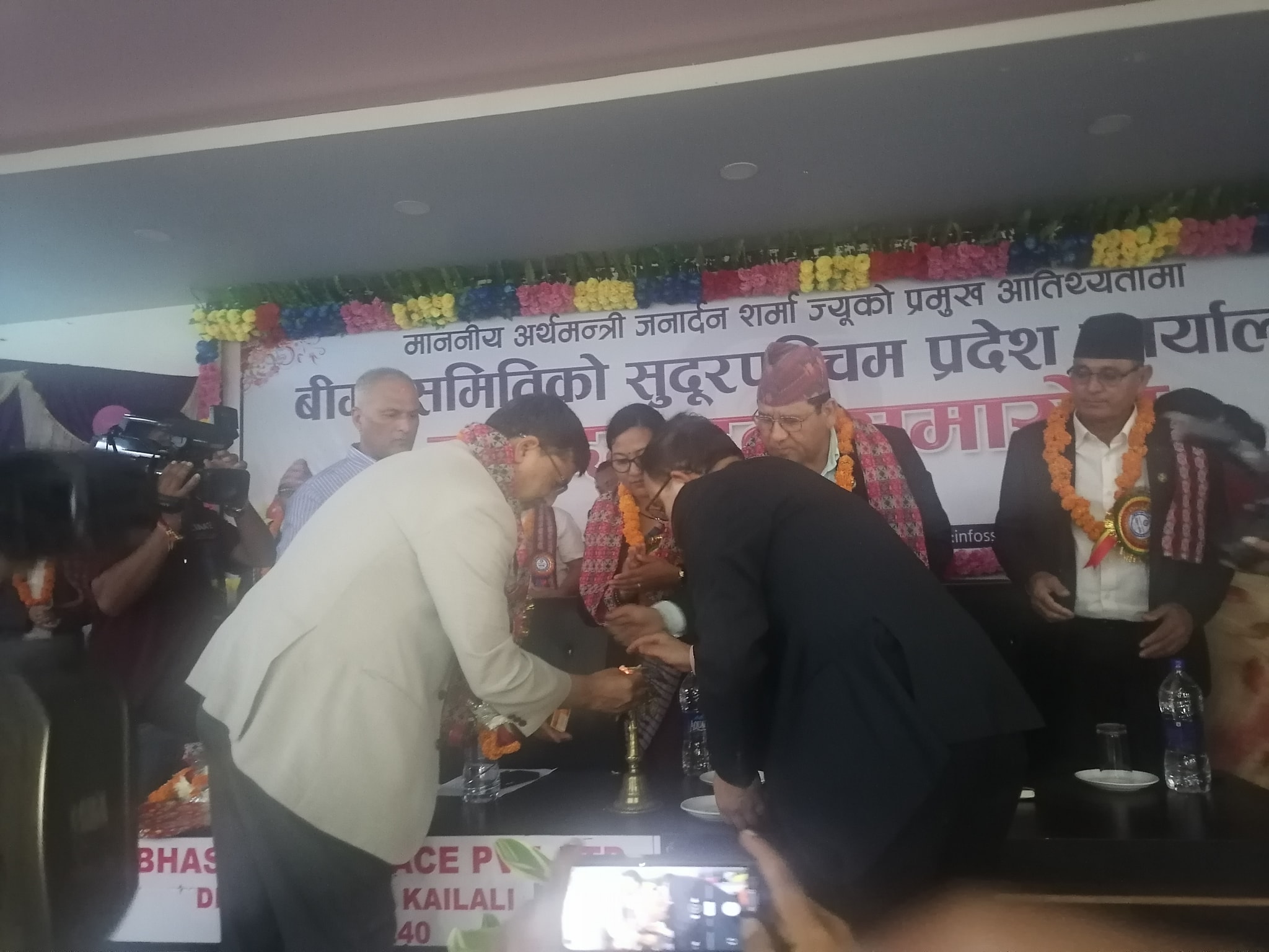काठमाडौं । अर्थमन्त्री जनार्दन शर्माले बीमा समितिको सुदुरपश्चित प्रदेश कार्यालयको भव्य उद्घाटन गरेका छन् । कार्यक्रममा अध्यक्ष सहित बीमा समितिका अध्यक्ष सूर्य प्रसाद सिलवाल, कार्यकारी निर्देशक राजुरमण पौडेल, समितिका निर्देशकहरु, कैलाली जिल्लाका प्रहरी प्रमुख, बीमा कम्पनीका प्रमुख कार्यकारी अधिकृतहरु लगायतको उपस्थिति थियो ।