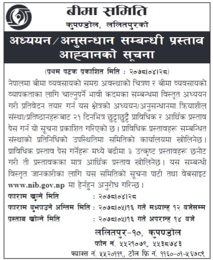 बीमा क्षेत्रको अध्ययन अनुसन्धानमा क्रियाशील संस्था/प्रतिष्ठानहरुले २१ दिन भित्र छुट्टा छुट्टै प्राविधिक र आर्थिक प्रस्ताव पेस गर्न पाउने समितिले जनाएको छ । उक्त प्राविधिक प्रस्तावहरु सम्बन्धित संस्थाको प्रतिनिधिको उपस्थितिमा समितिको कार्यालयमा खोलिने छ ।