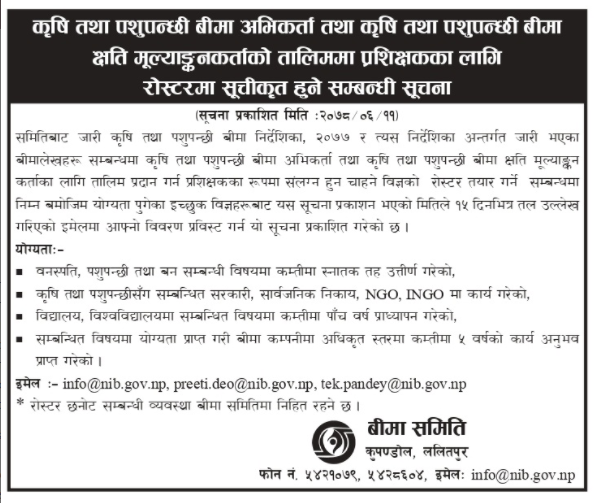 काठमाडौं । बीमा समितले कृषि तथा पशुपन्छी बीमा अभिकर्ता, कृषि तथा पशुपन्छी बीमा क्षति मूल्याङ्कनकर्ताको तालिममा प्रशिक्षक बन्न चाहनेको रोष्टर बनाउने भएको छ । समितिले योग्यता पुगेका विज्ञहरुलाई १५ दिन भित्रमा इमेल मार्फत आफ्नो विवरण पेश गर्न अनुरोध गरेको छ ।