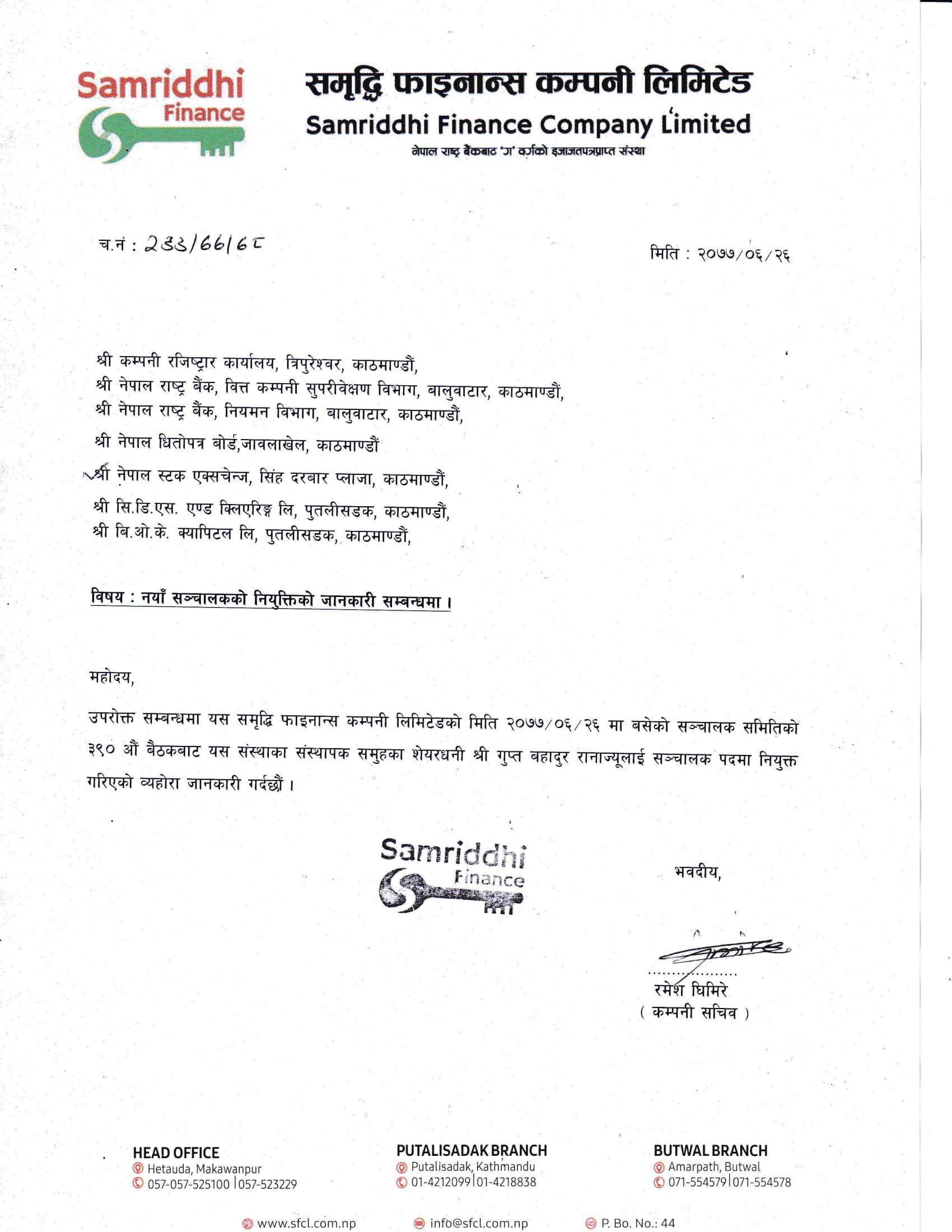 काठमाडौं । समृद्धि फाइनान्स लिमिटेडको सञ्चालकमा गुप्त बहादुर राना नियुक्त भएका छन् । कम्पनीको को संस्चालक समितिको असोज २६ गते बसेको संचालक समतिको बैठकले संस्थापक समुहका शेयरधनी रानालाई सञ्चालक पदमा नियुक्त गरिएको जनाएको छ ।