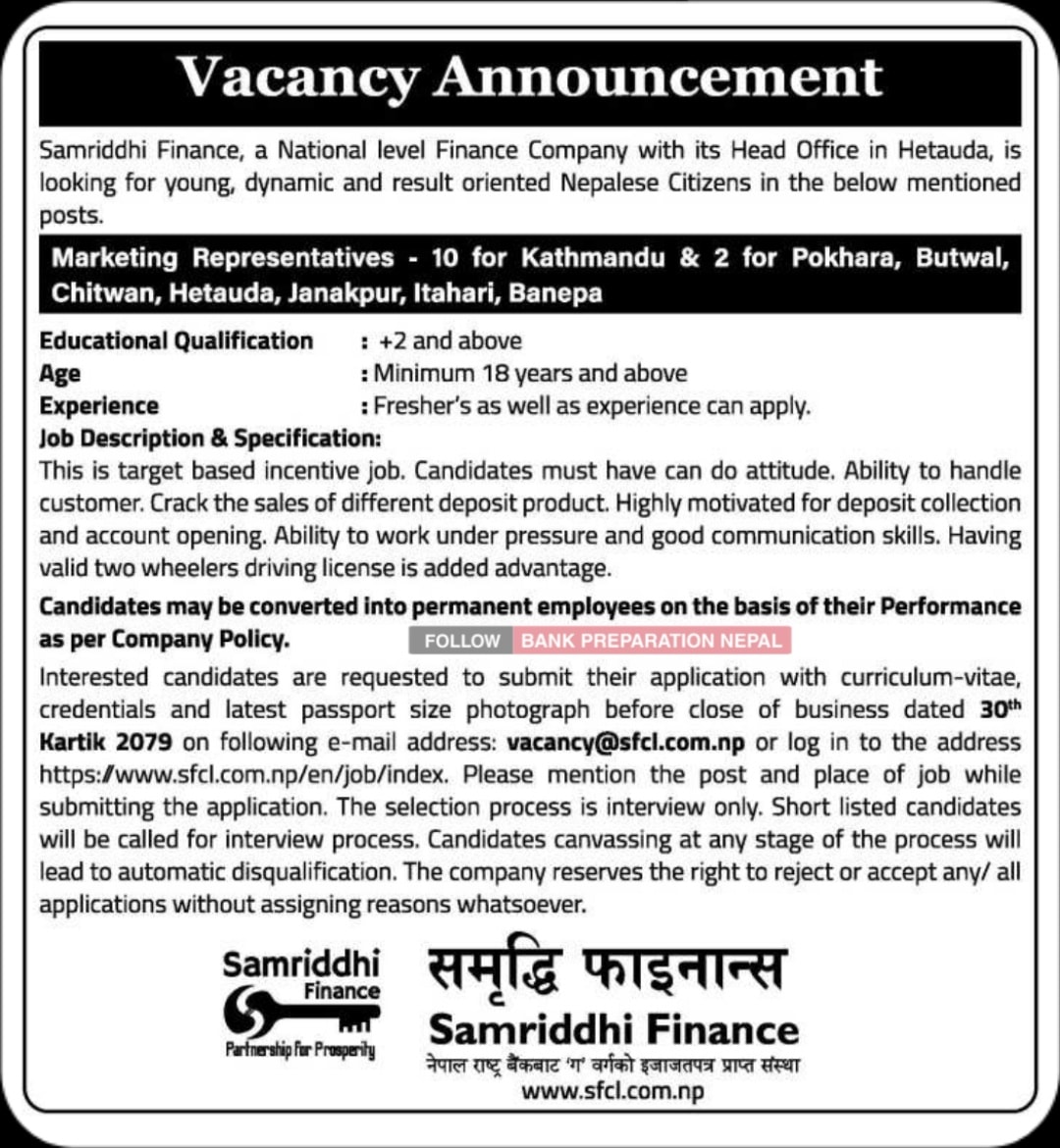 काठमाडौं । समृद्धि फाइनान्स कम्पनीले कर्मचारीको माग गरेको छ । कम्पनीले मार्केटिङ रिप्रिजेन्टिभसका लागि १० जना कर्मचारीको माग गरेको छ । कम्पनीले उपत्यका काठमाडौं, पोखरा, बुटवल, चितवन, हेटौंडा, जनकपुर, इटहरी र बनेपा शाखा कार्यालयका लागि कर्मचारीको माग गरेको हो । उक्त पदमा प्लस टु गरेको हुनुपर्नेछ । कम्तिमा १८ वर्ष पुरा भएको हुनुपर्नेछ । ईच्छुक तथा योग्यता पुगेकाले कार्तिक ३० गतेभित्र आवेदन दिनुपर्नेछ ।