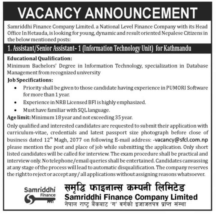 काठमाडौं । समृद्धि फाइनान्सले सिनियर असिसस्टेन र असिसस्टेन पदको लागि कर्मचारी माग गरेको छ । कम्पनीले इन्फरमेसन टेक्नेलेजी यूनिट काठमाडौंको लागि कर्मचारी माग गरेको हो ।