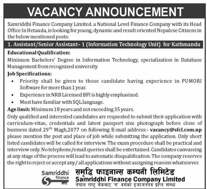 काठमाडौँ । समृद्धि फाइनान्स लिमिटेडले विभिन्न पदका लागि कर्मचारीको माग गरेको छ । फाइनान्स कम्पनीले असिसटेन्ट पदमा एक जना कर्मचारी माग गरेको जनाएको छ ।