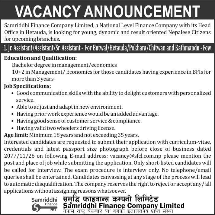 काठमाडौं । समृद्धि फाइनान्सले विभिन्न पदका लागि कर्मचारीको माग गरेको छ । कम्पनीले जुनियर असिस्टेन्ट, असिस्टेन्ट र सिनियर असिस्टेन्टका लागि केही कर्मचारीको माग गरेको छ । कम्पनीले बुटवल, हेटौडा, पोखरा, चितवन र काठमाडौंका लागि कर्मचारीको माग गरेको ननाएको छ ।