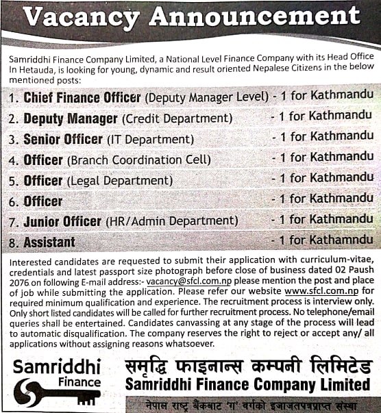 काठमाडौं । समृद्धि फाइनान्सले विभिन्न पदका लागि कर्मचारीको माग गरेको छ । संस्थाले चिफ फाइनान्स अफिसरका लागि १ जना, डेपुटी म्यानेजरका लागि १ जना, सिनियर अफिसरका लागि १ जना, अफिसरका लागि १ जना, अफिसर लेगलका लागि १ जना, अफिसरका लागि १ जना, जूनियर अफिसरका लागि १ जना र असिस्टेन्टका लागि १ जना गरी ८ जना कर्मचारीको माग गरेको हो ।