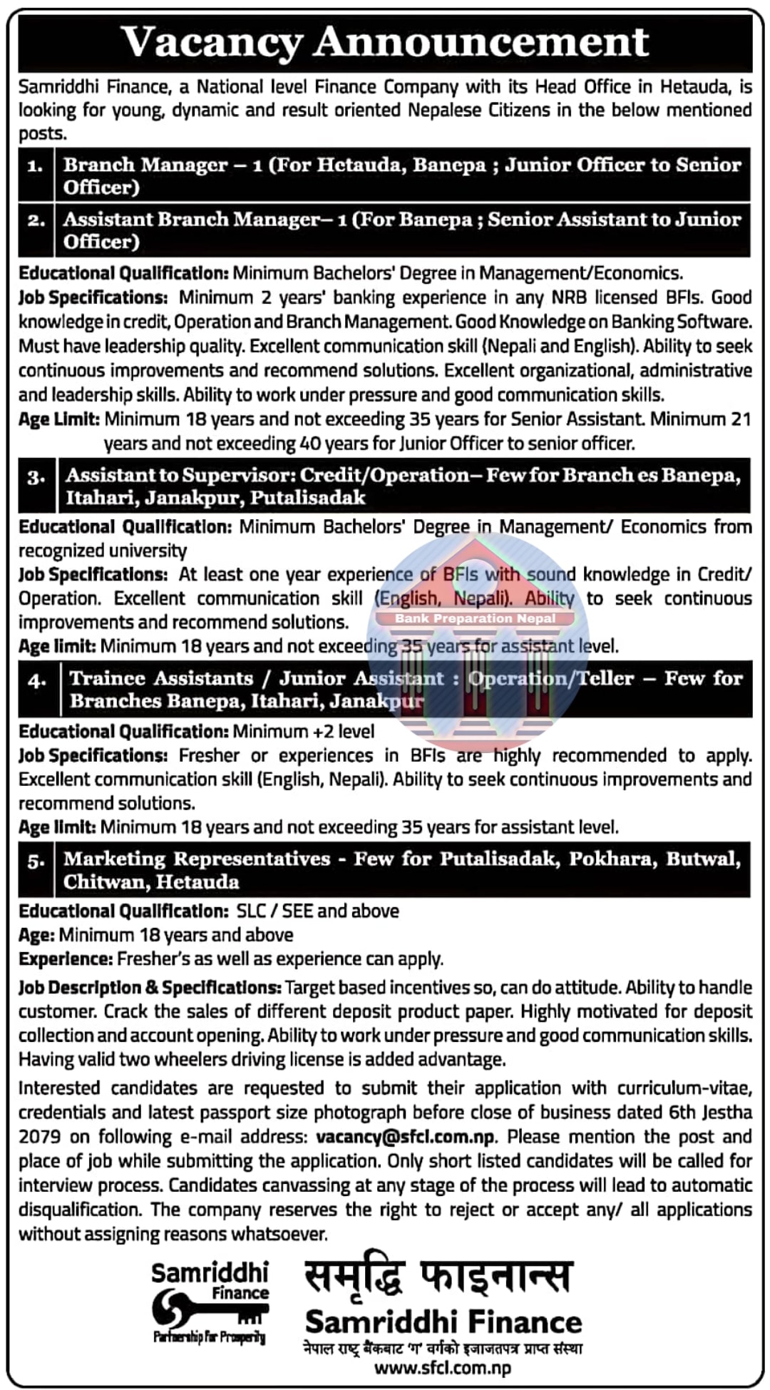 काठमाडौं । समृद्धि फाइनान्स कम्पनीले विभिन्न पदका लागि कर्मचारीको माग गरेको छ । कम्पनीले ब्रान्च म्यानेजरमा जुनियर अफिसरदेखि सिनियर अफिसरसम्मका लागि केही, असिस्टेन्ट ब्रान्च म्यानेजरमा सिनियर असिस्टेन्टदेखि जुनियर अफिसरसम्मका लागि केही, असिस्टेन्टदेखि सुपरभाइजरका लागि केही , ट्रेनी असिस्टेन्टका लागि केही र मार्केटिङ रिप्रिजेन्टीटिभका लागि केही संख्यामा कर्मचारीको माग गरेको हो ।