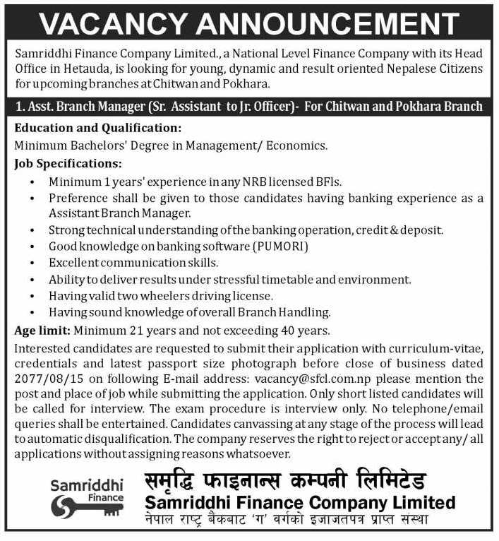 काठमाडौँ । समृद्धि फाइनान्स लिमिटेडले कर्मचारीको माग गरेको छ । फाइनान्सले चितवन र पोखराको लागि ब्रान्च म्यानेजर पदका लागि कर्मचारीको माग गरेको जनाएको छ ।