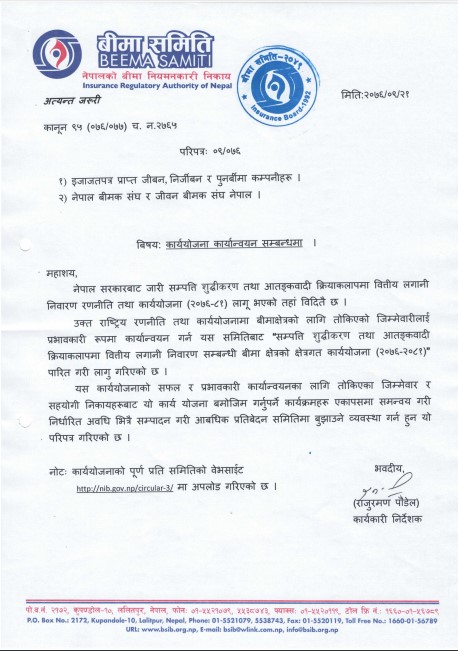 काठमाडौं । बीमा समितिले सम्पत्ति शुद्धिकरण तथा आतङ्कवादी क्रियाकलापमा वित्तीय लगानी निवारण सम्बन्धमा सबै बीमा कम्पनीहरुलाई एक निर्देशन जारी गर्दै सम्पती शुद्धिकरण निवारण सम्बन्ध निकायसँग समन्वय गरेर काम गर्न भनेको छ ।