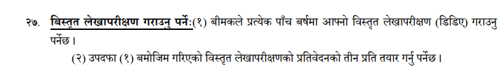 सुशासन निर्देशिका अनुसार बीमा कम्पनीहरुले प्रत्येक पाँच वर्षमा आफ्नो विस्तृत लेखापरिक्षण ‘डिडिए’ गराउनु पर्ने व्यवस्था छ । अवदेखि सम्पुर्ण कम्पनीहरुले प्रत्येक ५/५ वर्षमा डिडिए गर्नै पर्ने हुन्छ । कम्पनीको वित्तीय अवस्था के कस्तो छ भन्ने थाहा पाउनका लागि पनि यसलाई अनिवार्य गरिएको पौडेलले जानकारी दिए ।