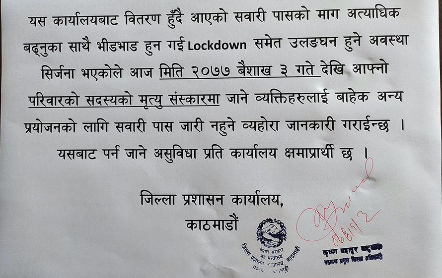 काठमाडौंका सहायक प्रमुख जिल्ला अधिकारी कृष्णबहादुर राउतले लकडाउन प्रभावकारी पार्न आज बुधबार (वैशाख ३) देखि लागू हुनेगरी सवारी पास वितरण बन्द गरिएको बताए ।