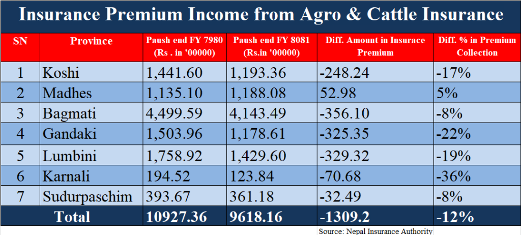 प्राधिकरणका अनुसार चालु आवको पुससम्ममा निर्जीवन बीमकले गण्डकी प्रदेशबाट जम्मा ११ करोड ७८ लाख ६१ हजार रुपैयाँ संकलन गरेका छन्। गत आवको सोही अवधिमा गण्डकीबाट १५ करोड ३० लाख ३६ हजार रुपैयाँ संकलन भएको थियो। लुम्बिनी प्रदेशमा १९ प्रतिशत, कोशीमा १७ प्रतिशत, बागमती र सुदूरपश्चिम प्रदेशमा समान ८ प्रतिशतले कृषि तथा पशुपन्छी बीमाबापतको बीमाशुल्क आम्दानी घटेको छ।