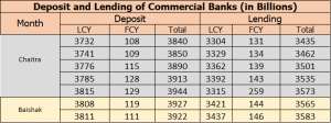 तर यहि अवधिमा कर्जा लगानी भने ९ अर्बले बृद्धि भएको छ । बैशाख १० गतेसम्ममा बाणिज्य बैंकहरुले ३५ खर्ब ८३ अर्ब रुपैयाँको कर्जा लगानी गरेका छन् । बैशाख पहिलो साता कर्जा लगानी घटेको भएता पनि दोस्रो सातामा कर्जा लगानी भने बढेको देखिन्छ ।
