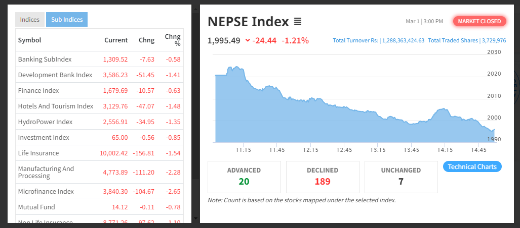 बैंक वित्तीय संस्थाले कर्जा उठाउन नसकेकोदेखि लिएर अझै आर्थिक संकट चुलिने विश्लेषण हुन थालेको छ । यसले पनि लगानीकर्तालाई त्रसिद बनाउदै गइरहेको छ । बुधबार नेप्से सूचक २४.४४ अंकले तल झर्दा कारोबार रकम एक अर्ब २८ करोडमा सिमित भएको छ । प्राविधिक विश्लेषकहरुले यहि आज बजारमा सुधार देखियो भने बढ्न सुरु हुने आकलन गरेका थिए । तर बजार बजार सुधार भन्दा पनि तल झर्यो ।