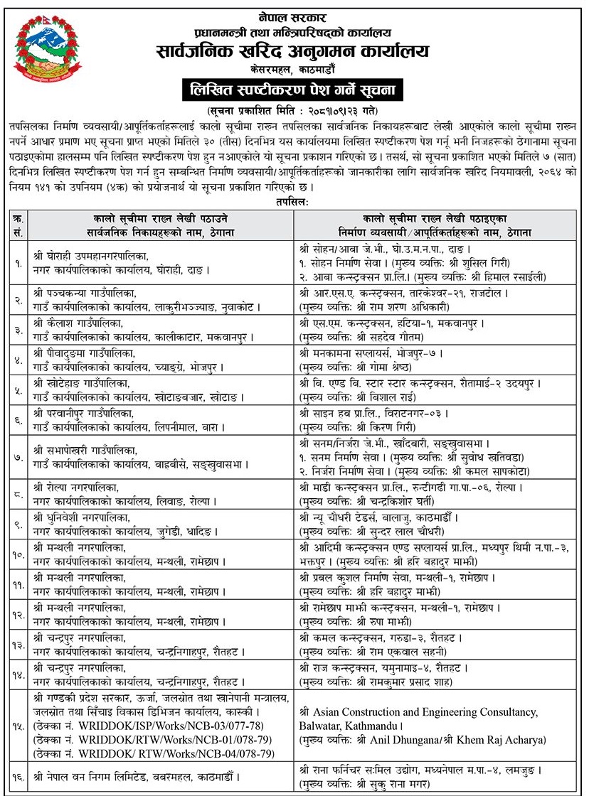 विभिन्न सार्वजनिक निकायले ती कम्पनीलाई कालोसूचीमा राख्न कार्यालयसमक्ष सिफारिस गरेका छन्। कार्यालयले भने ती कम्पनीलाई कालोसूचीमा राख्नु नपर्ने आधार प्रमाणसहित स्पष्टीकरण पेस गर्न निर्देशन दिएको छ।
