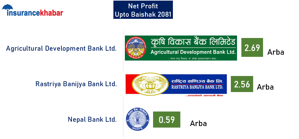 त्यस्तै दोस्रोमा राष्ट्रिय वाणिज्य बैंकको नाफा २ अर्ब ५६ करोड रुपैयाँ रहेको छ। नेपाल बैंकको नाफा वैशाख महिनासम्म ५९ करोड रुपैयाँ रहेको छ।