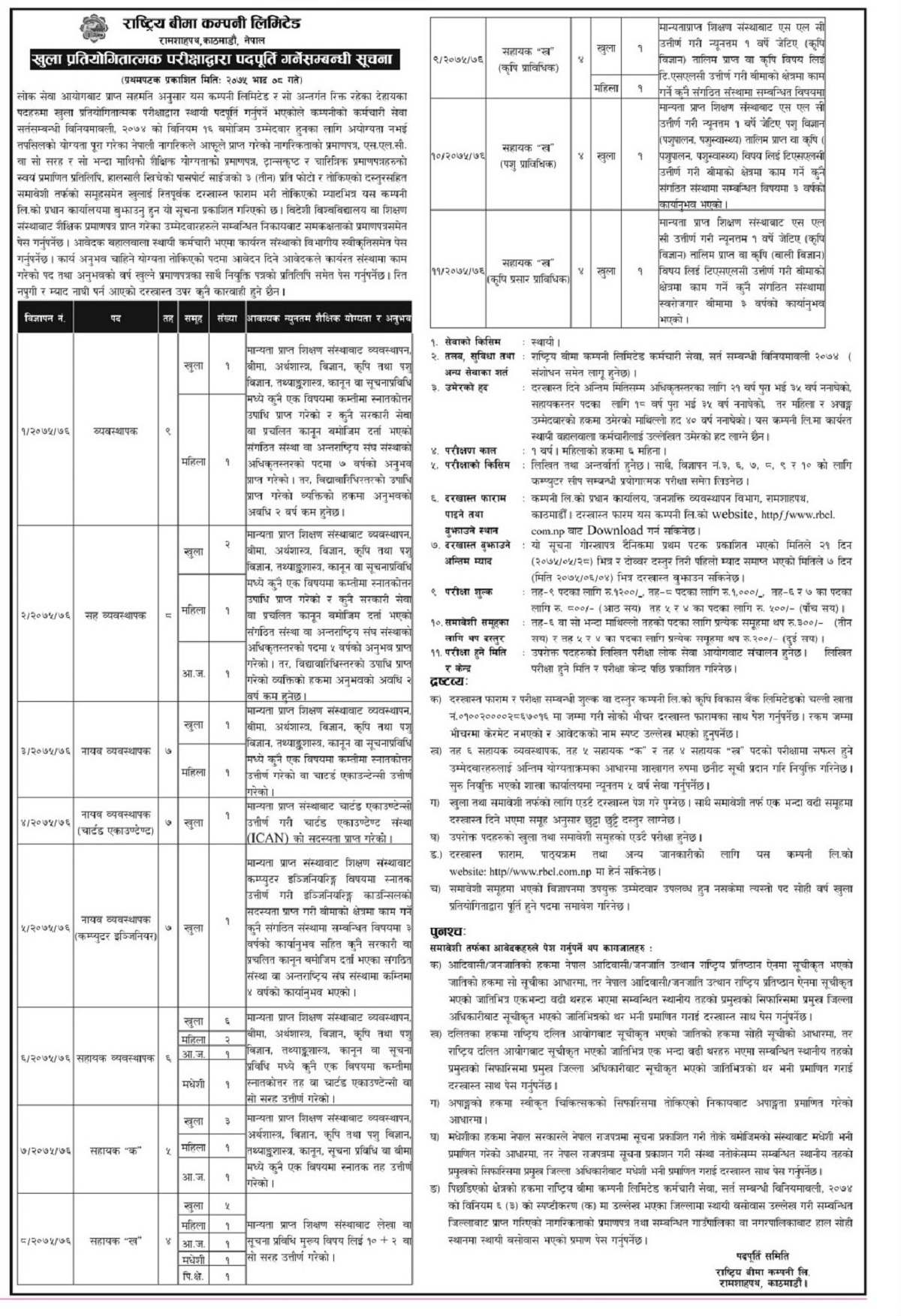छैठौं तहको सहायक व्यवस्थापकको लागि १० जनाको विज्ञापन खुला गरिएको छ। यसको लागि तोकिएका विषयमा स्नातकोत्तर गरेको हुनु पर्नेछ। ५औं तहको सहायक ‘क’ पदको लागि ५ जना माग गरिएको छ। यसको लागि तोकिएको विषयमा स्नातक गरेको हुनु पर्नेछ। सहायक ‘ख’ पदको लागि ११ जना लेखा वा सुचना प्रविधिमा प्लस टु गरेको हुनु पर्छ। त्यस्तै यसै तहमा दुर्इ जना जेटिए प्राविधक माग गरिएको छ।