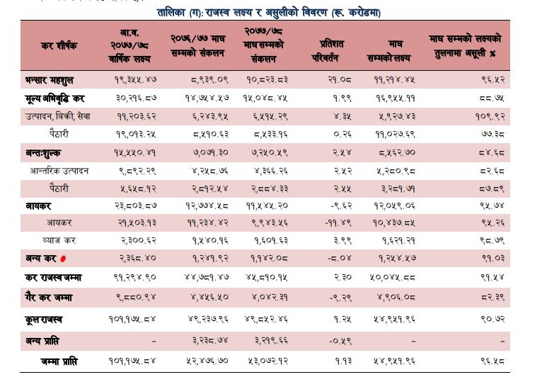 चालु वर्षको माघसम्मको शिर्षकगत लक्ष्इमा आन्तरिक तर्फ मूल्य अभिबृद्धि कर शिर्षकको राजस्व लक्ष्य भन्दा बढी संकलन भएको छ भने अन्य शिर्षकको राजस्व संकलनमा कमी आई समग्र राजस्व संकलन लक्ष्यको ९०.७ प्रतिशत संकलन भएको छ । यस अवधिमा भन्सा विन्दुमा संकलन भएको राजस्व ९.८ प्रतिशतले बढेर २ खर्ब २२ अर्ब पुगेको छ भने आन्तरिकतर्फ संकलन भएको राजस्वमा ३.८ प्रतिशतले संकुचन भइ २ खर्ब ३५ करोड रुपैयाँ रहेको छ ।