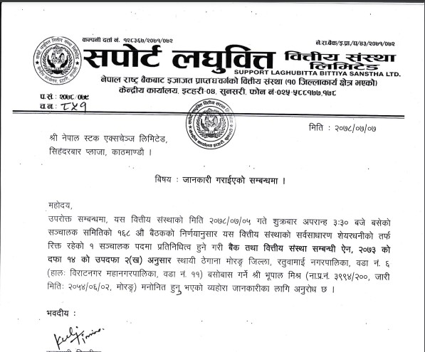 काठमाडौं । सर्पोट लघुवित्त वित्तीय संस्थाको रिक्त रहेको सर्वसाधारण शेयरधनीको तर्फको सञ्चालक पदमा भूपाल मिश्र मनोनित भएका छन् । गत कात्तिक ५ गते बसेको सञ्चालक समितिको बैठकले रिक्त रहेको सञ्चालक पदमा मिश्रलाई मनोनित गरेको हो ।