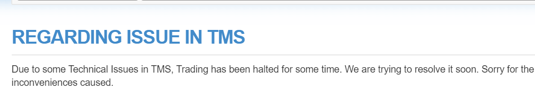 आज मध्यान्ह अन्दाजी १२ः २० को समयदेखि नेप्सेको टिएमएसमा समस्या आएको छ । तर, नेप्सेले के कारणले समस्या आयो भन्ने पत्ता लगाउने काम भइरहेको बताए । उनले भने, ‘हामी समस्या पत्ता लगाउत प्रयासरत छौं । छिट्टै समस्या समाधान गरेर कारोबार खोल्छौं र स्थगित भएको समय बराबर समय थप गर्छौै ।’ उनले शेयर खरिद बिक्रीकर्ताहरुलाई केहीबेर धैर्य गर्न आग्रह गरेका छन् ।