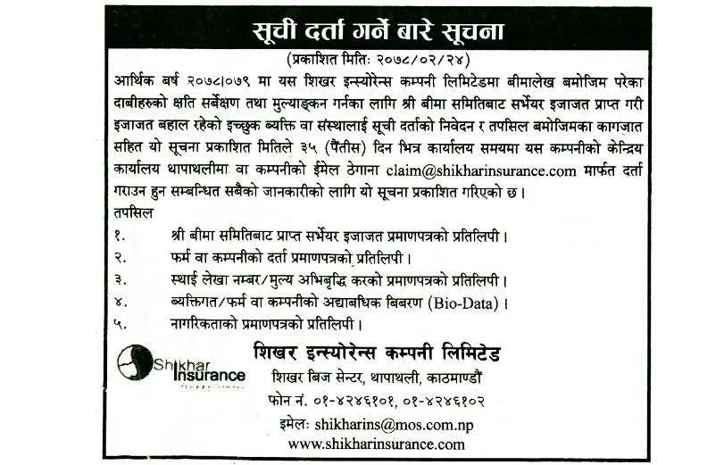 सर्भेयरलाई सूचि दर्ता गर्न शिखर इन्स्योरेन्सको आग्रह