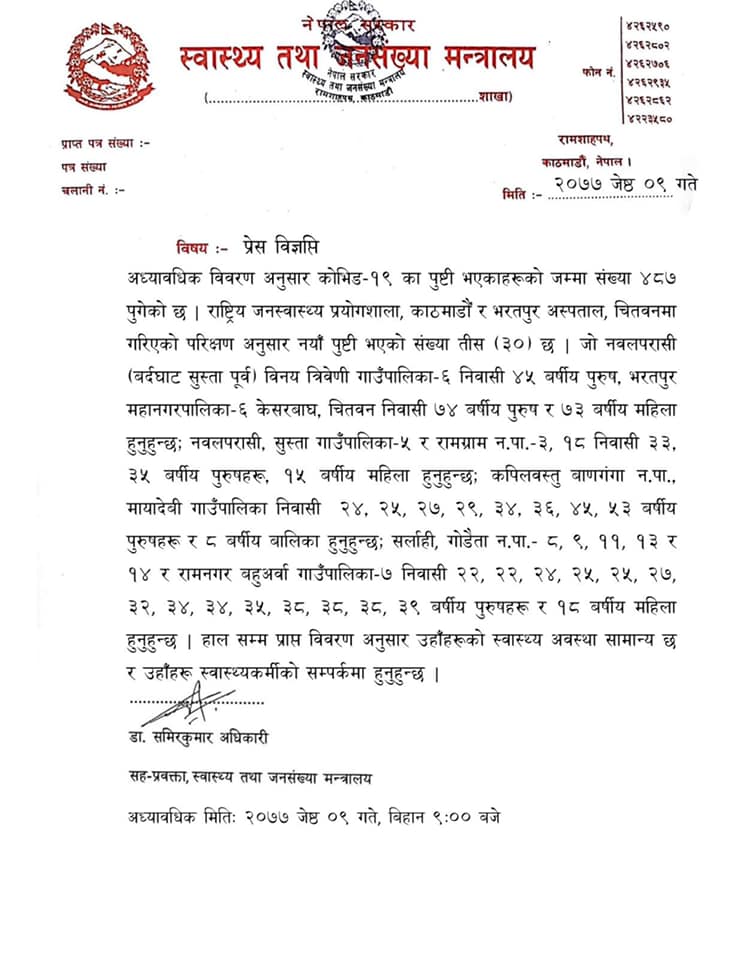 काठमाडौं । आज विहान सर्लााही, कपिलबस्तु, चितवन, नवलपरासी १ र २ जिल्लामा गरी कूल ३० जना कोरोना संक्रमित फेला परेका छन् । यससँगै कूल संक्रमितको संख्या पाँच सय नजिक अर्थात ४८७ पुगेको छ ।